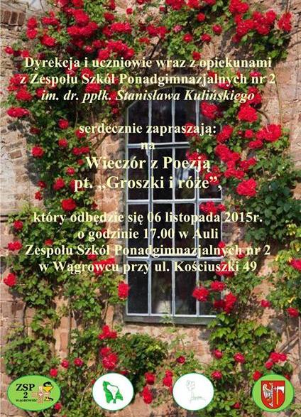 W ramach XII ogólnopolskiej kampanii „Hospicjum to też Życie”, młodzież wraz z opiekunami z Zespołu Szkół Ponadgimnazjalnych nr 2 im. dr. ppłk. Stanisława Kulińskiego w Wągrowcu, po raz siódmy, była organizatorem Wieczoru z Poezją pt. „Groszki i róże”.