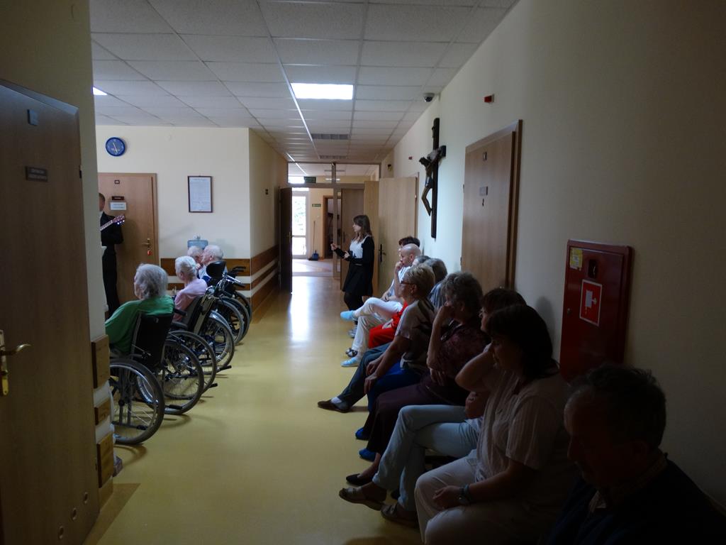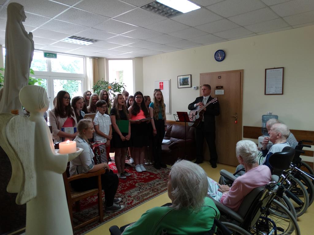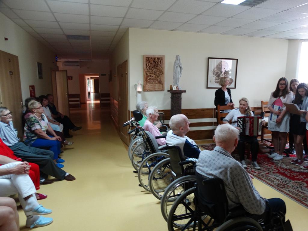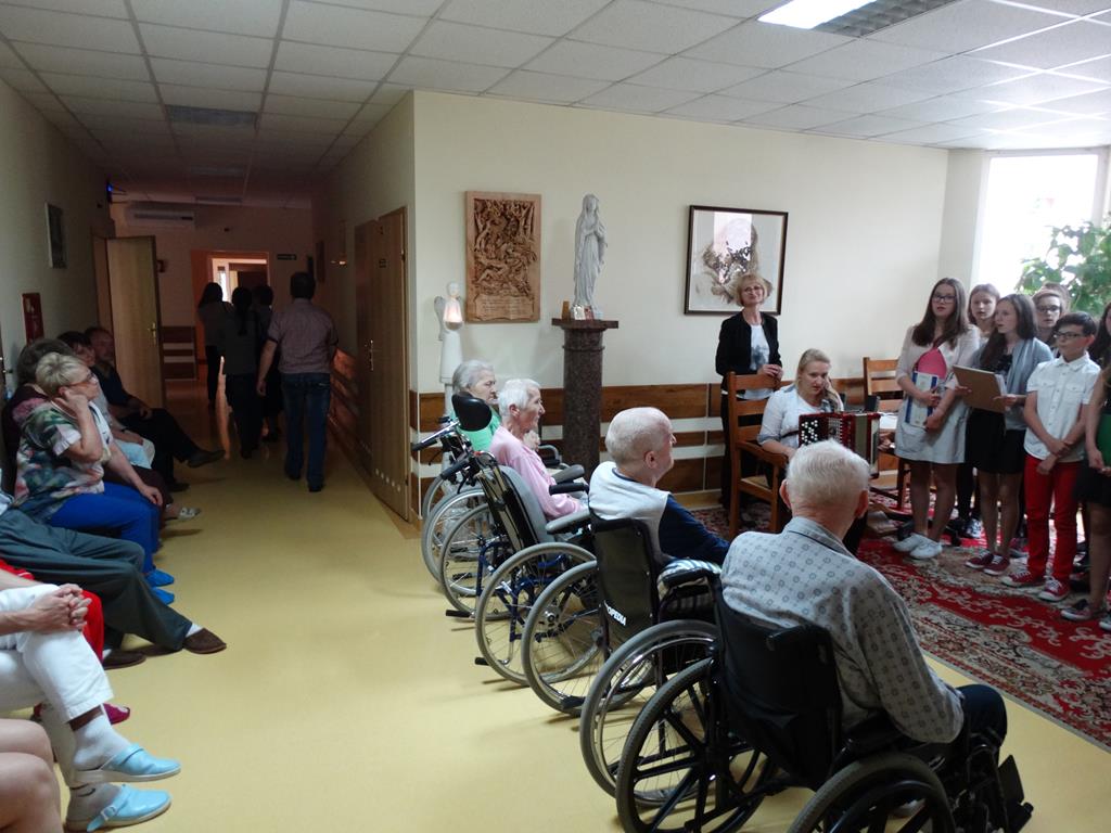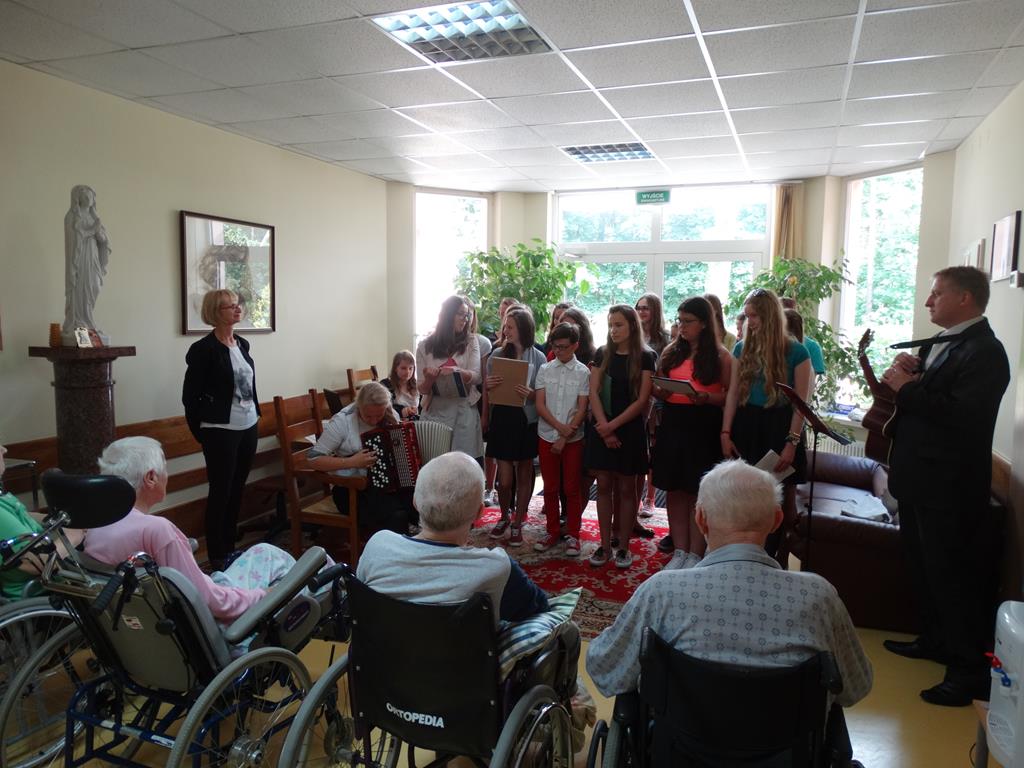 Wolontariusze z Gimnazjum nr 1 w Wągrowcu w hospicjum -10-06.2015 Grupa wolontariuszy wraz z opiekunami z Gimnazjum nr 1 w Wągrowcu odwiedziła chorych w hospicjum z koncertem.